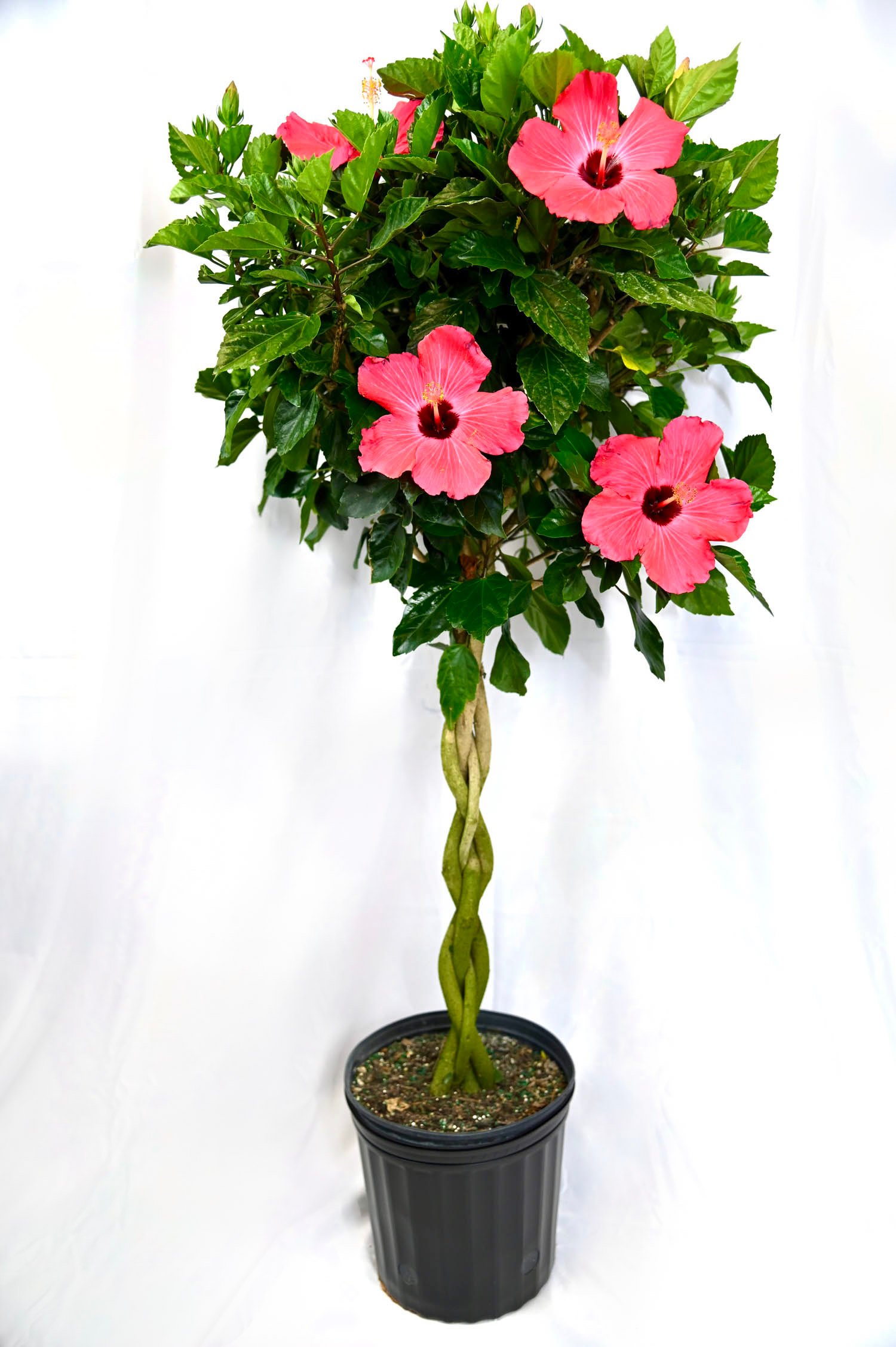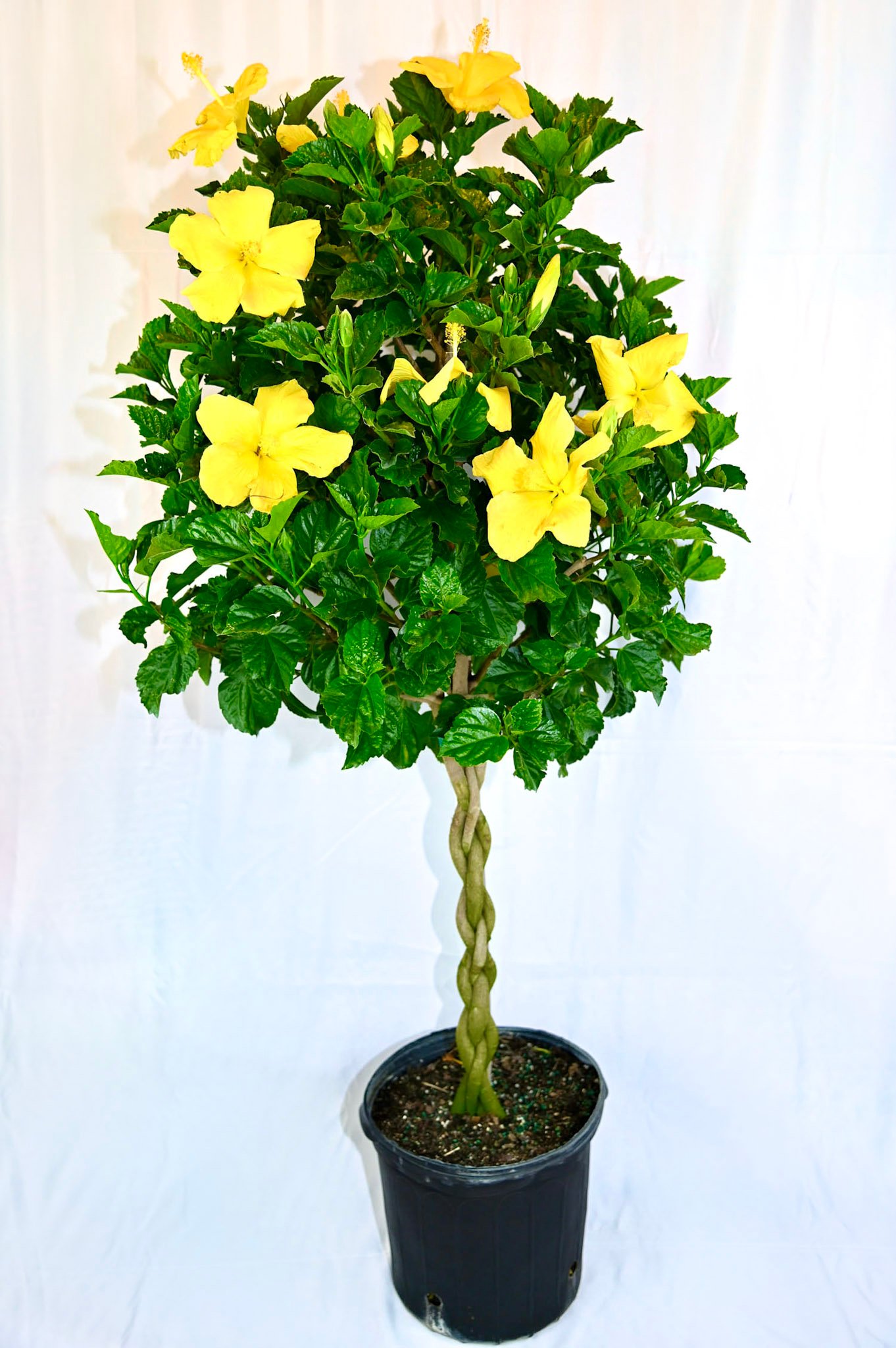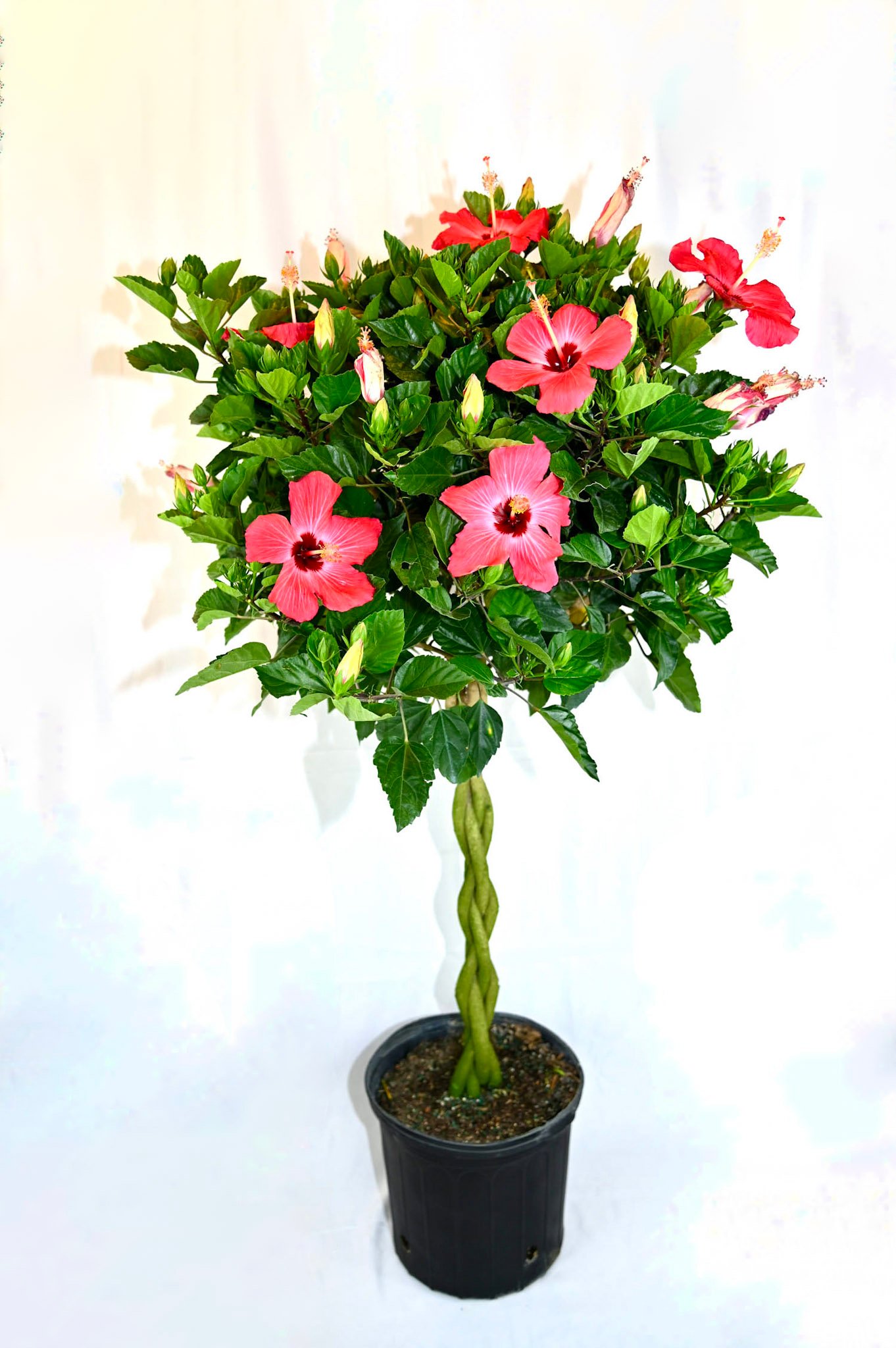 Colorful braided hibiscus with assorted bloom shades, ideal as a patio showpiece or garden accent.