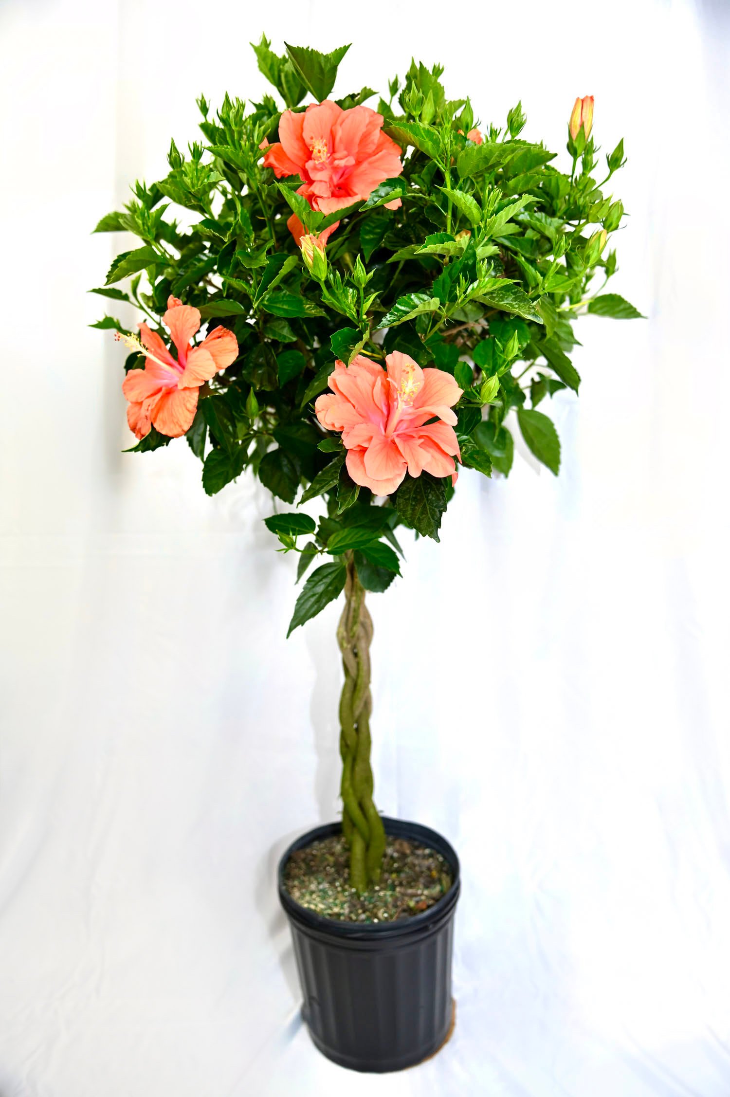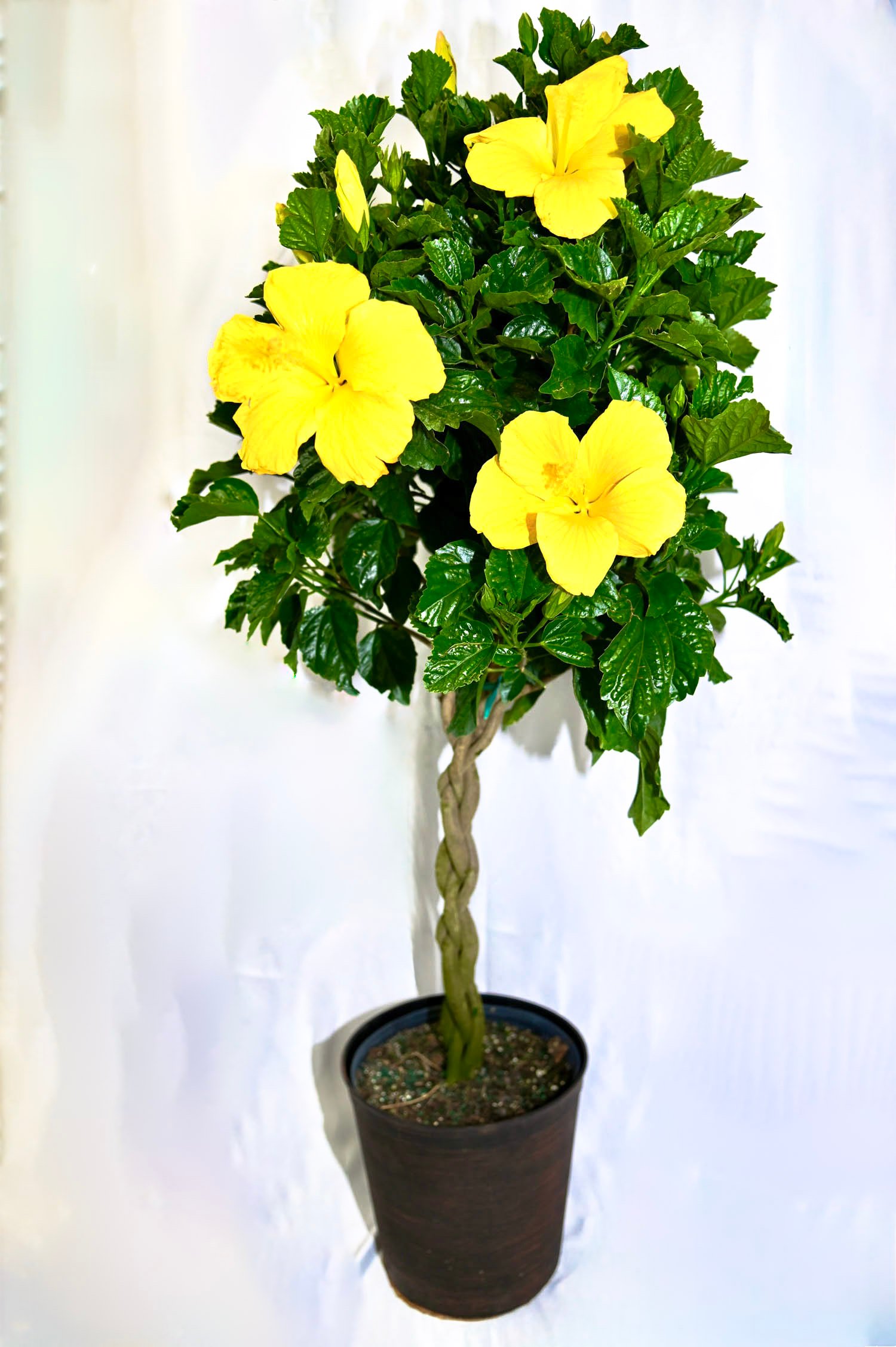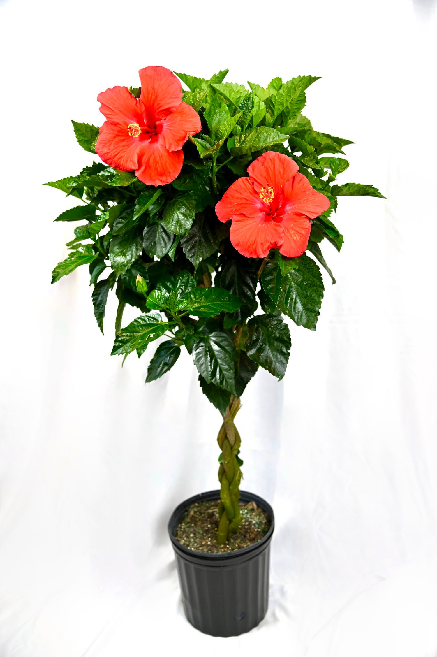 Colorful braided hibiscus with assorted bloom shades, ideal as a patio showpiece or garden accent.