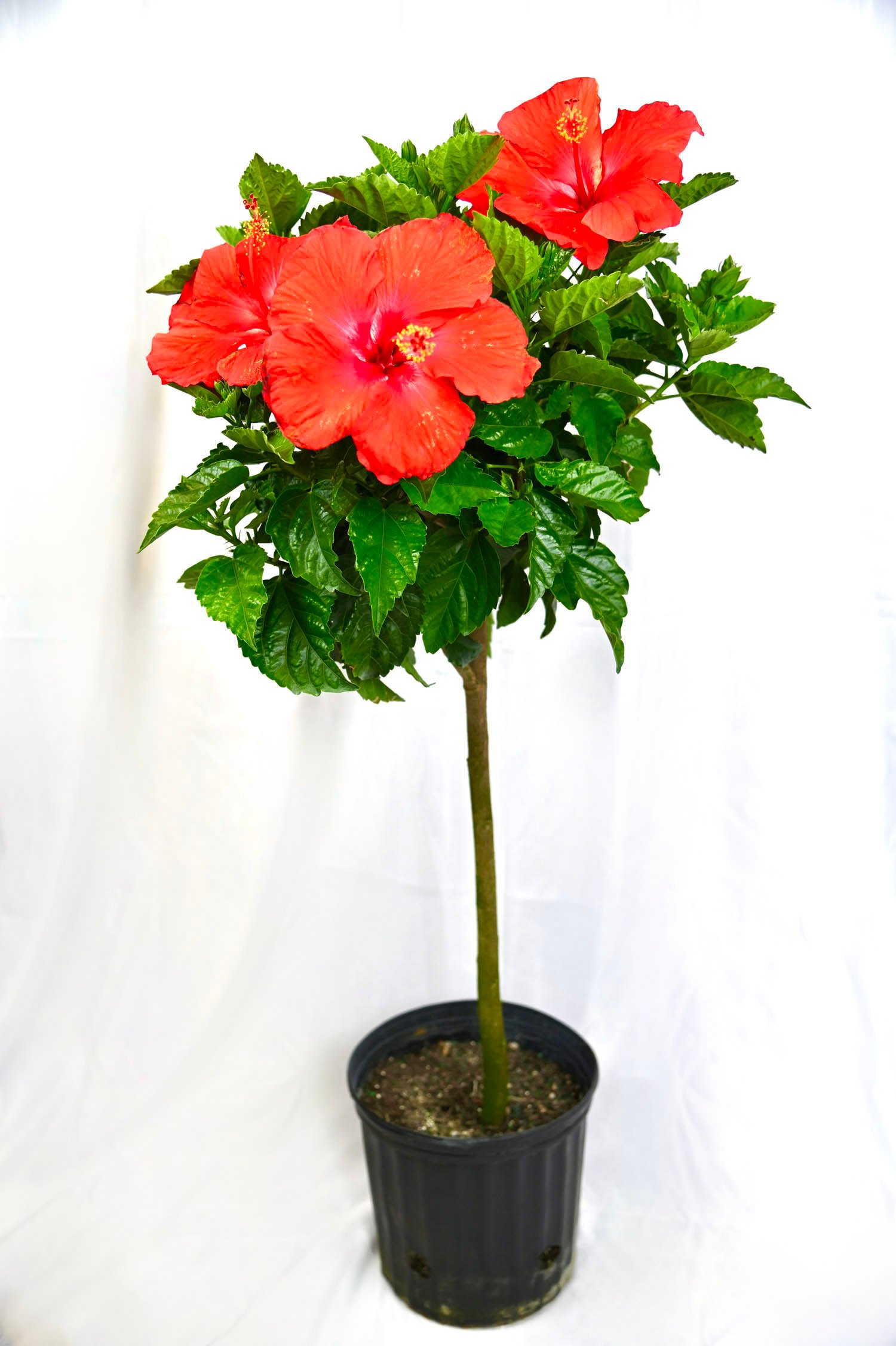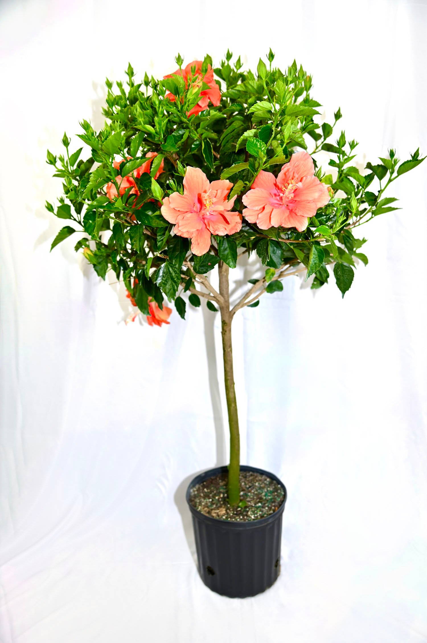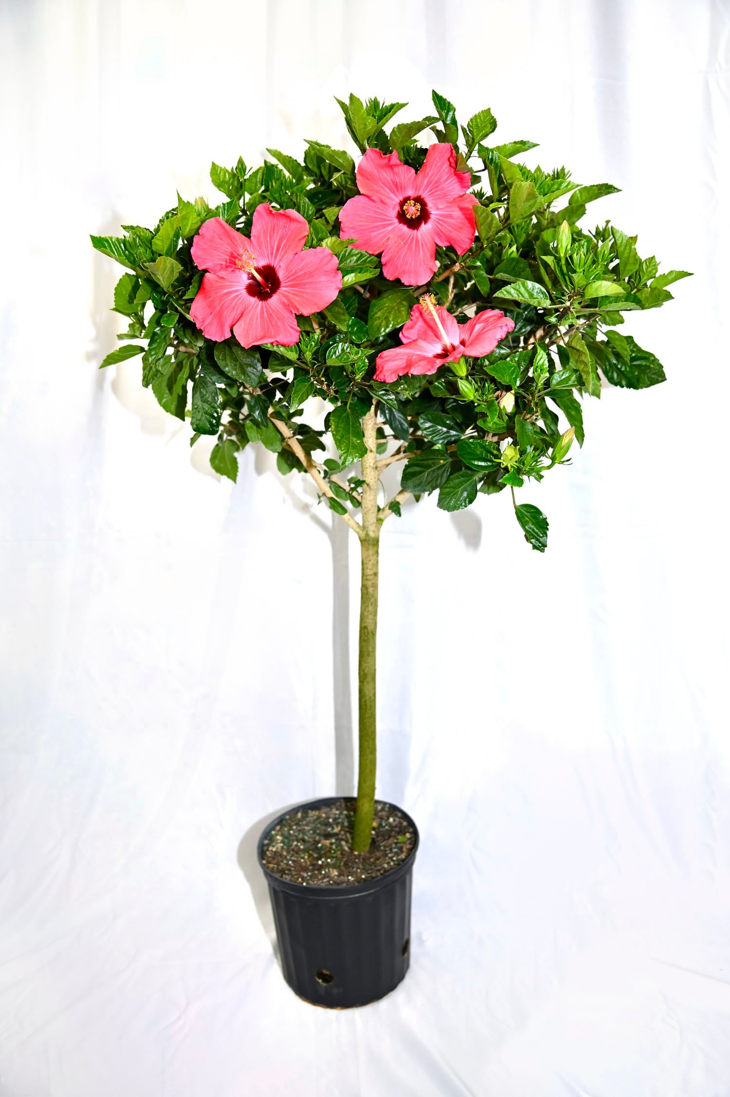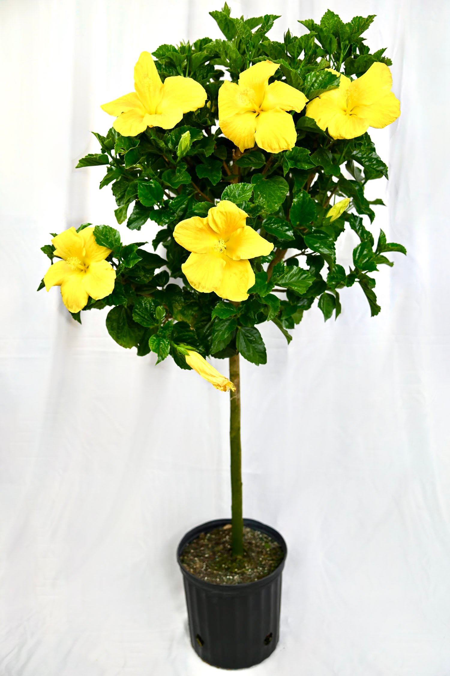 Single-stem hibiscus plant with assorted flower colors, trained for an elegant, upright form.