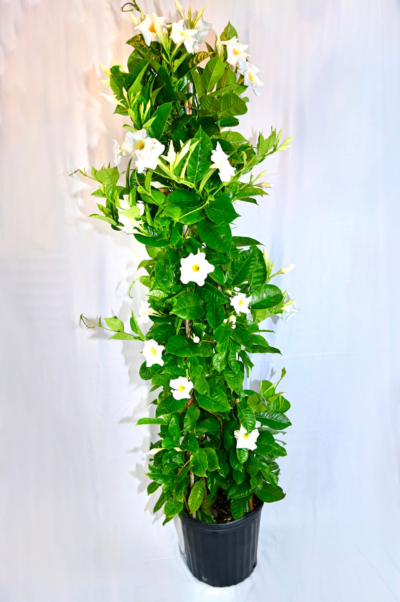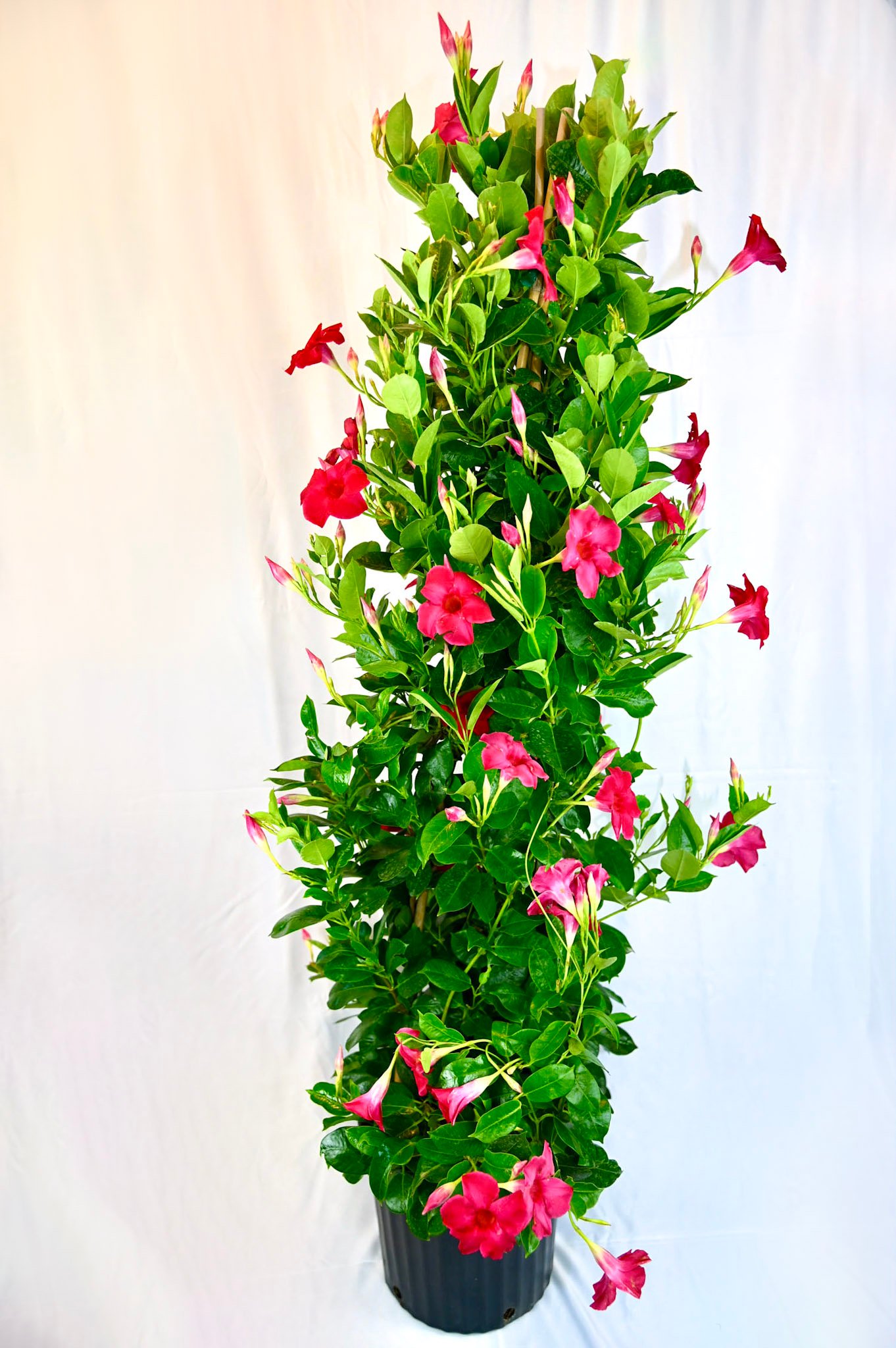 Specialty teepee structure featuring bold pink, red, white, and raspberry kiss Mandevilla blooms.