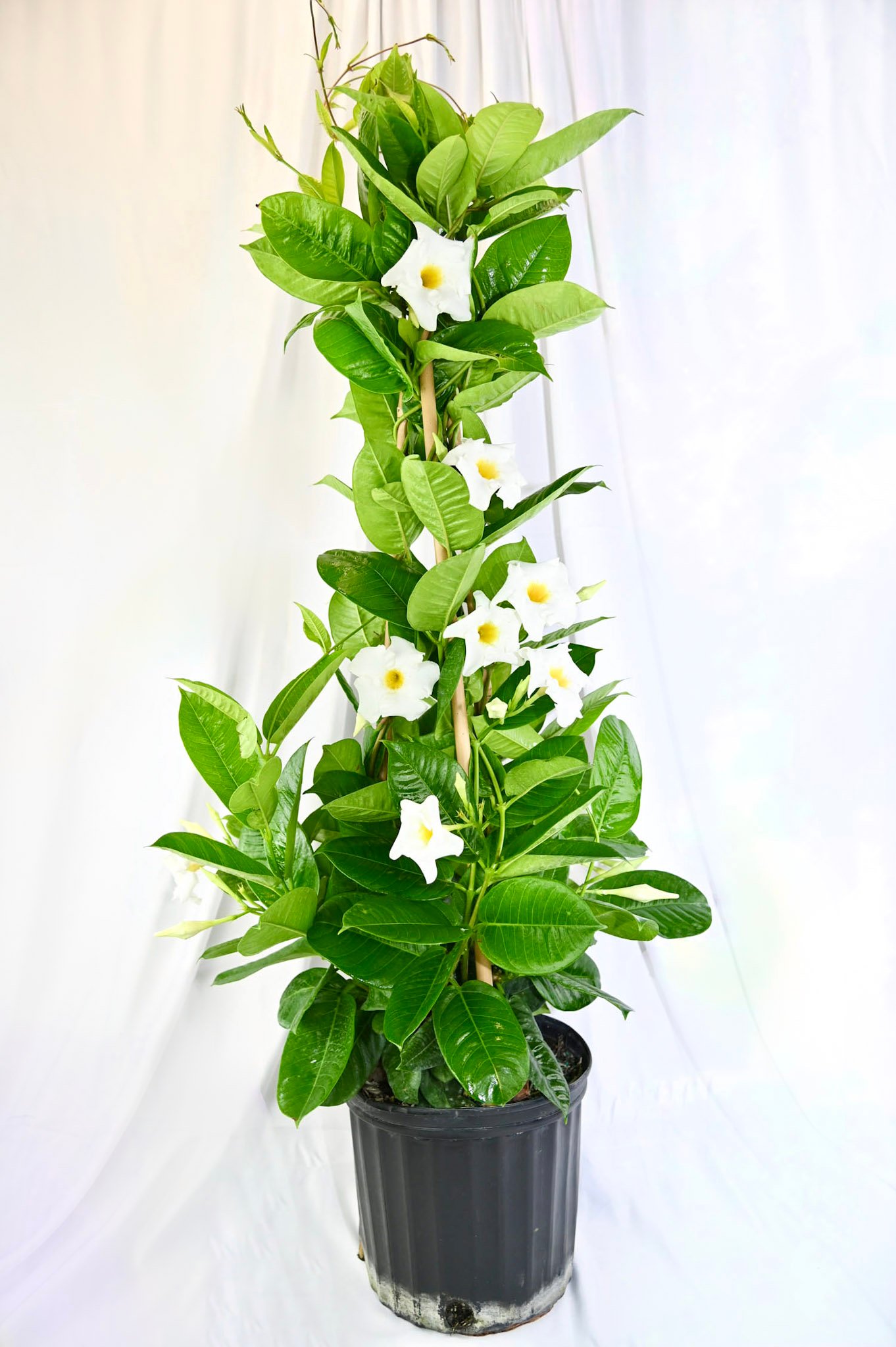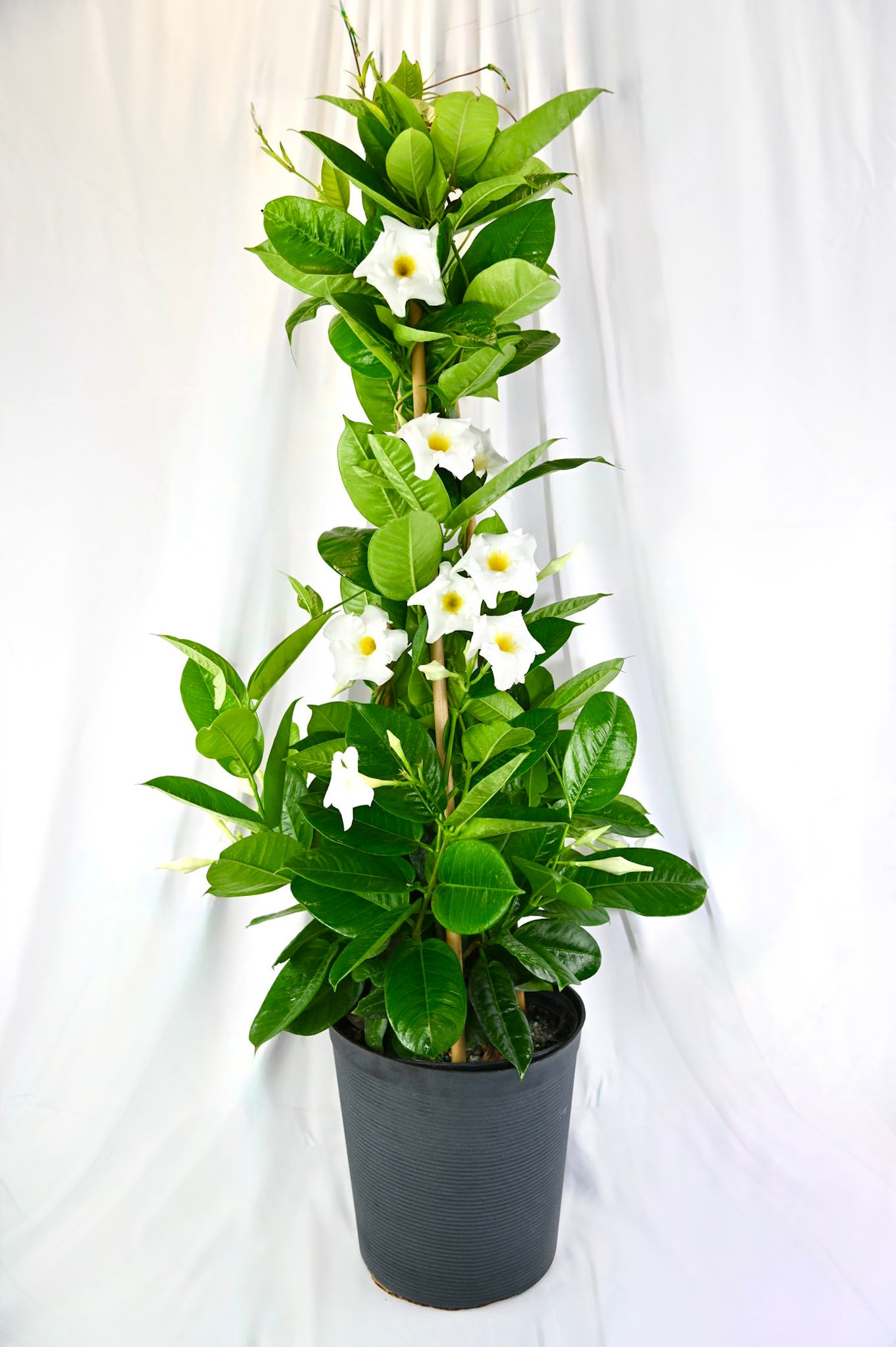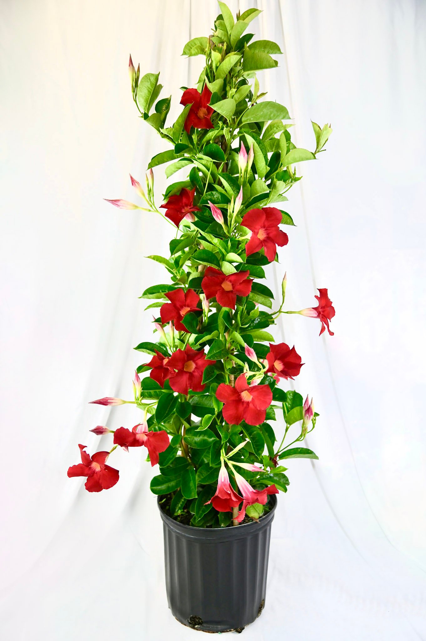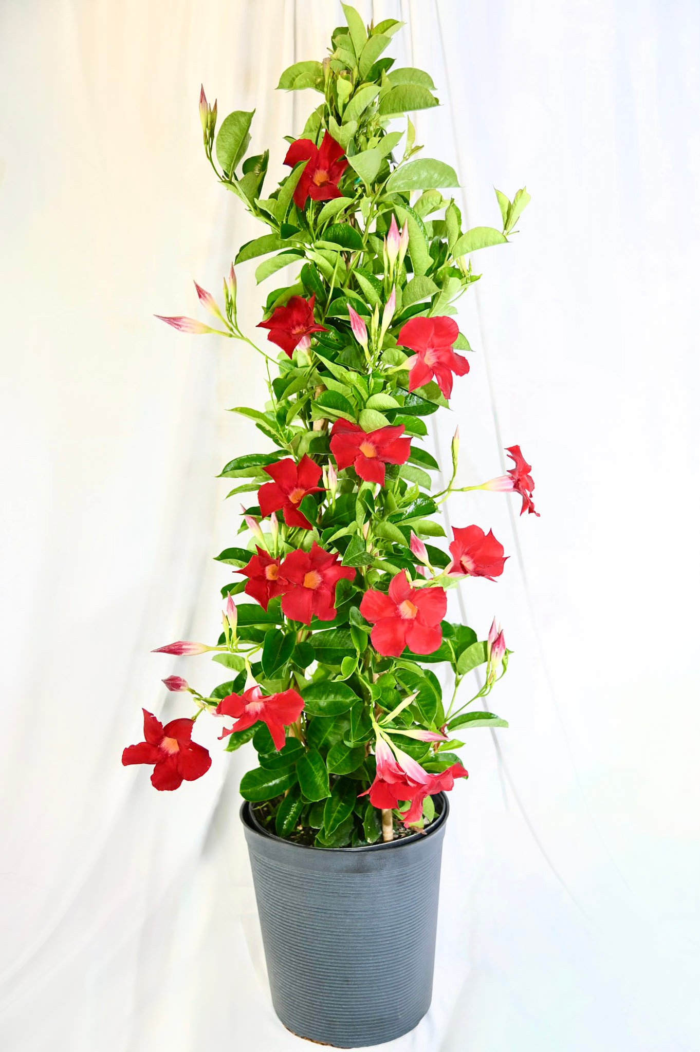 Free-standing mandevilla structure with showy blooms, great as a garden centerpiece.